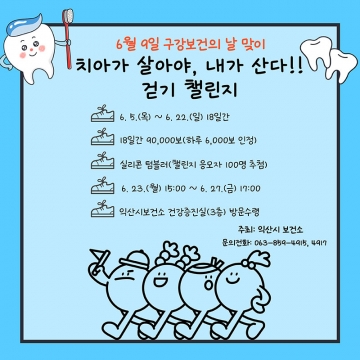 이진윤 보건소장은 "이번 걷기 챌린지를 통해 건강의 중요성을 되새기고일상 속 실천으로 건강한 삶을 이어가는 계기가 되길 바란다"며 "많은 관심과 적극적인 참여를 당부드린다"고 전했다.