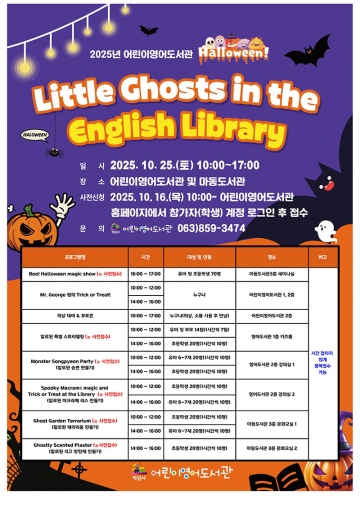 또한 원어민 선생님이 들려주는 핼러윈 이야기, 오싹하고 신기한 마술공연도 마련돼 즐거움을 더한다. 프로그램 참여 신청은 오는 16일 오전 10시부터 어린이영어도서관 누리집(lib.iksan.go.kr/eng_lib)에서 선착순으로 진행된다.